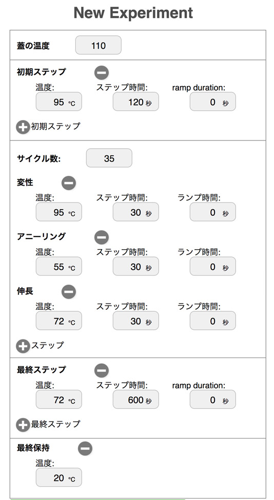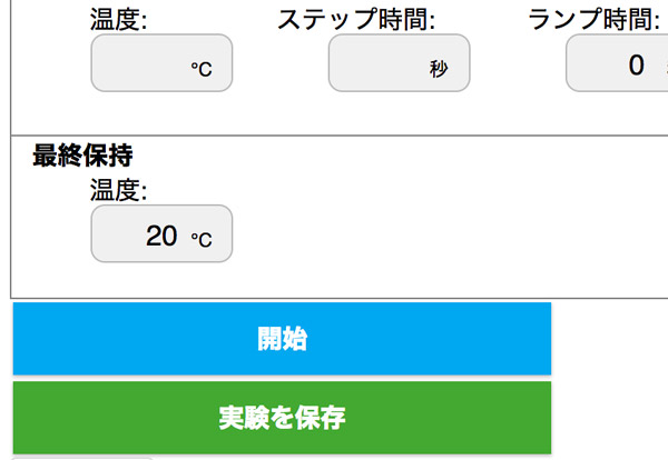 ステップには温度とホールド時間を指定します。ゆっくりと温度遷移させる必要がある場合は、遷移時間 (ランプ時間) を指定することもできます。ランプ時間を空欄または0にした場合、可能な限り速く温度遷移します。