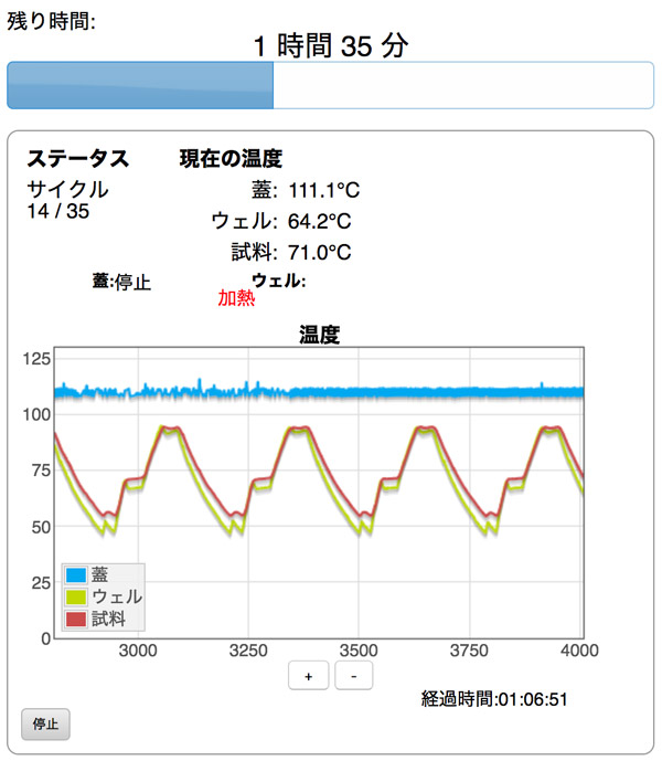 実験が終わると、画面に「実験完了」 と表示されます。この状態でも最終段階での温度維持が行われており、ファンも回っていますので、それを止めるには「停止」ボタンを押します。